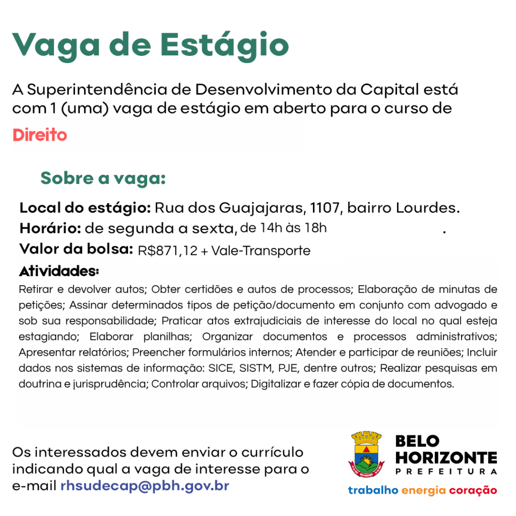Estágio (NPJ) : 08h00 às 12h00 e 13h00 às 17h00 3409-8642 npj@direito.ufmg.br