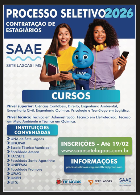 O Serviço Autônomo de Água e Esgoto de Sete Lagoas – SAAE, autarquia municipal de Sete Lagoas/MG, informa que está com Processo Seletivo aberto para contratação de estagiários.